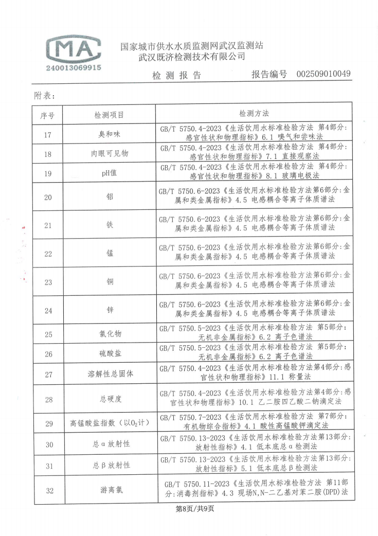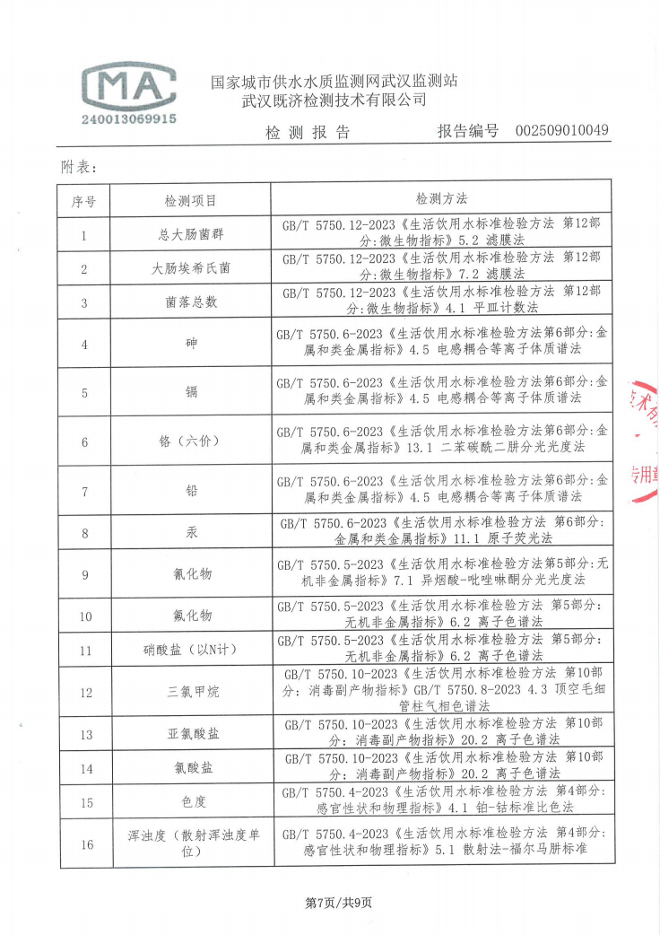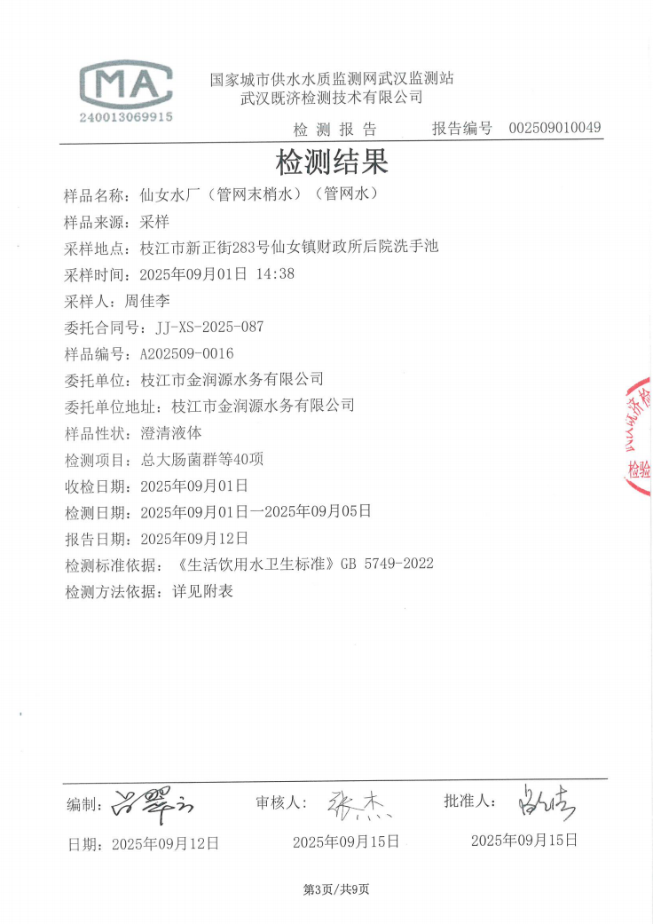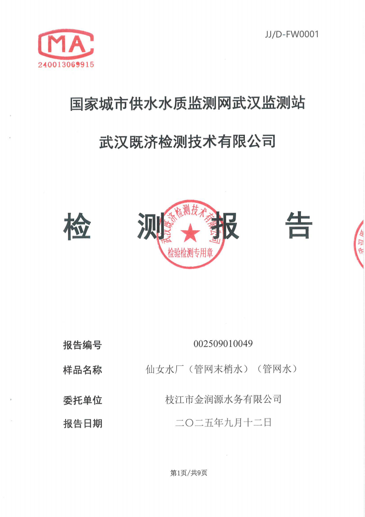 2025年9月仙女水厂管网末梢水水质检测公告