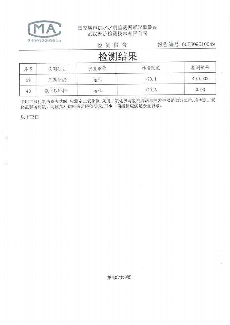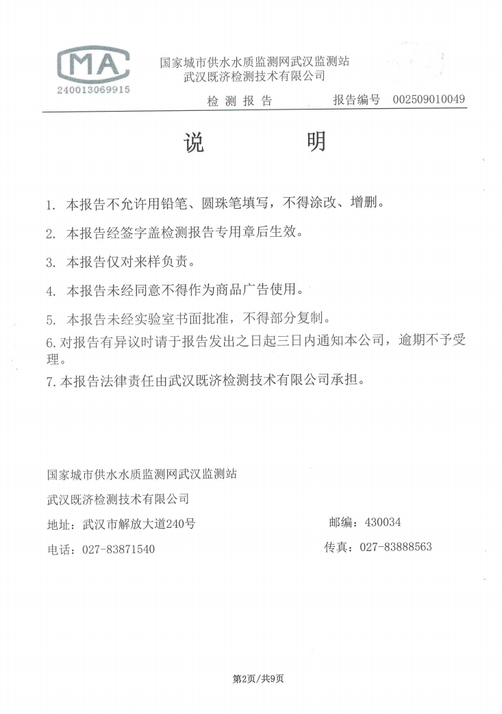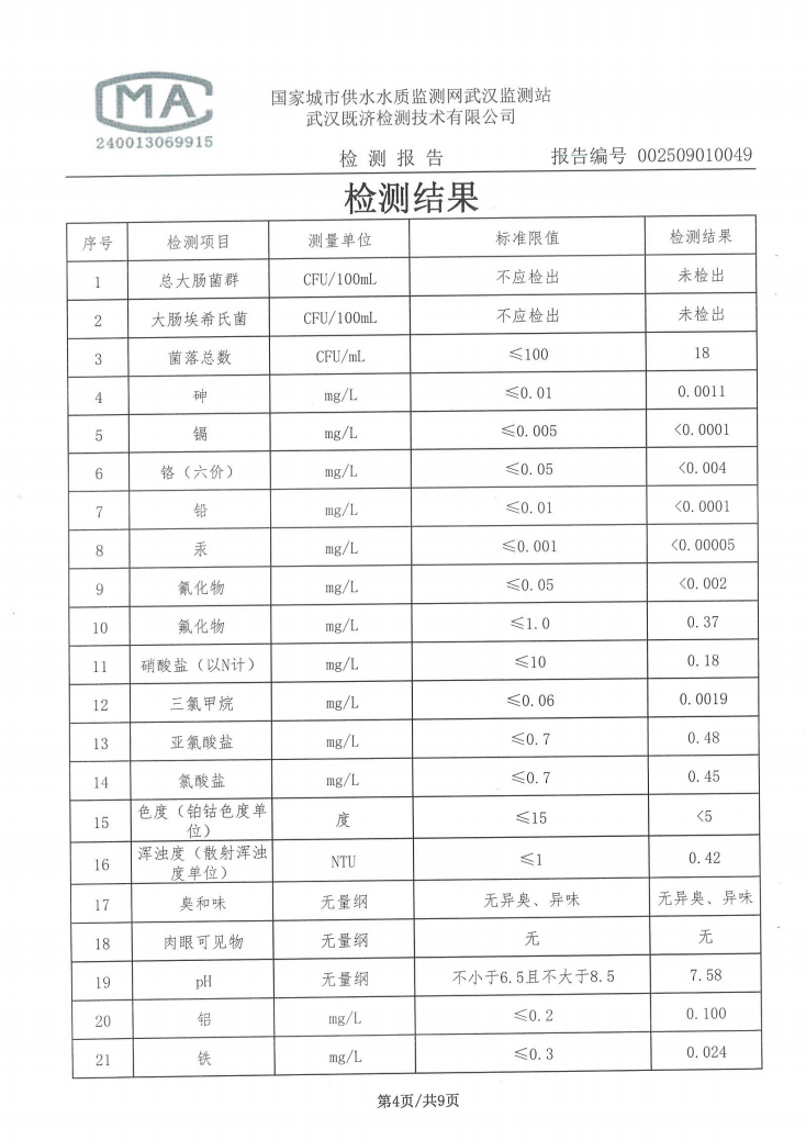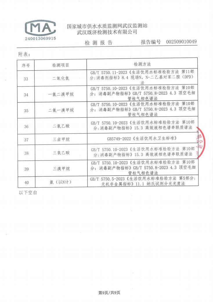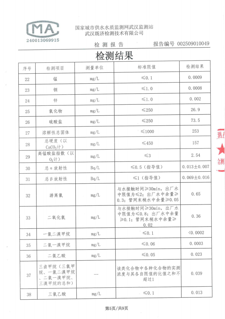 2025年9月仙女水厂管网末梢水水质检测公告