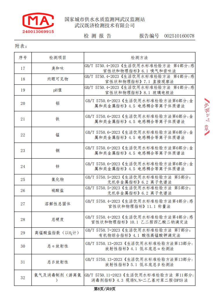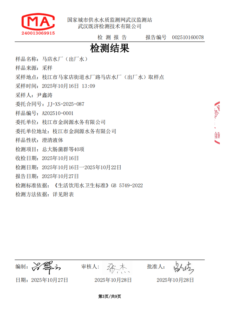 2025年10月马店水厂二次供水末梢水水质检测公告